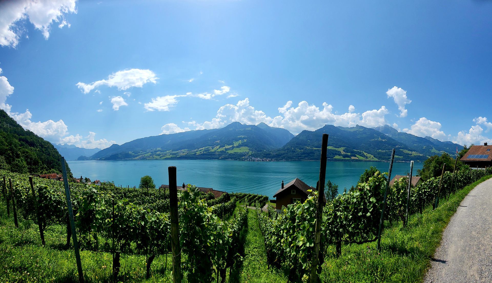 Stube mit Kachelofen und Panoramablick auf Walensee und Hafen von Quinten